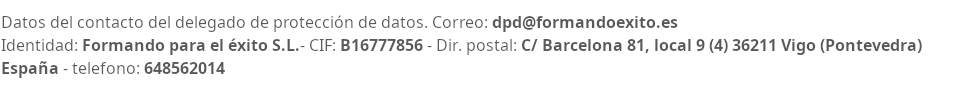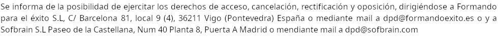 En Sofbrain S.L. y Formando para el éxito S.L. tratamos la información que nos facilita con el fin de prestarles el servicio solicitado y realizar la facturación del mismo. Los datos proporcionados se conservarán mientras se mantenga la relación comercial o durante los años necesarios para cumplir con las obligaciones legales. Los datos no se cederán a terceros salvo en los casos en que exista una obligación legal. Usted tiene derecho a obtener confirmación sobre si en Sofbrain S.L. o Formando para el éxito S.L. estamos tratando sus datos personales por tanto tiene derecho a acceder a sus datos personales, rectificar los datos inexactos o solicitar su supresión cuando los datos ya no sean necesarios.